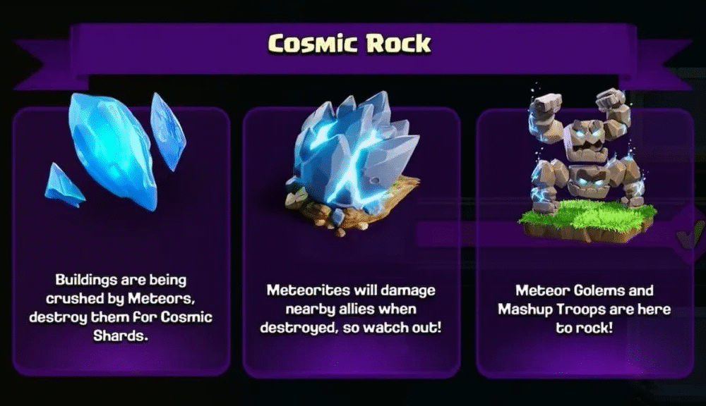 Durante todo octubre, los jugadores con Municipio (Town Hall) nivel 6 o superior podrán participar en Cosmic Rock, un evento especial dentro de la temporada Cosmic Curse. En esta ocasión, meteoritos caerán sobre las aldeas antes de las batallas, destruyendo defensas y dejando fragmentos cósmicos que podrán recolectarse al eliminar esas estructuras.