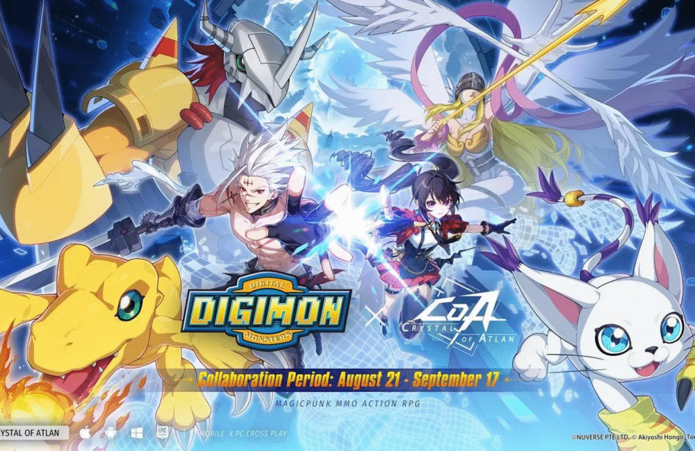 El MMORPG de acción y mundo abierto Crystal of Atlan, desarrollado por Nuverse y publicado por Skystone Games, lanzó el 21 de agosto de 2025 una colaboración especial con el clásico anime Digimon Adventure. Esta actualización gratuita está disponible en dispositivos móviles, PC y PlayStation 5. La colaboración se volvió viral en redes sociales después de que los fanáticos descubrieran que los Digimon pueden ser compañeros de personajes femeninos, lo que generó una gran interacción en plataformas como Twitter y TikTok.